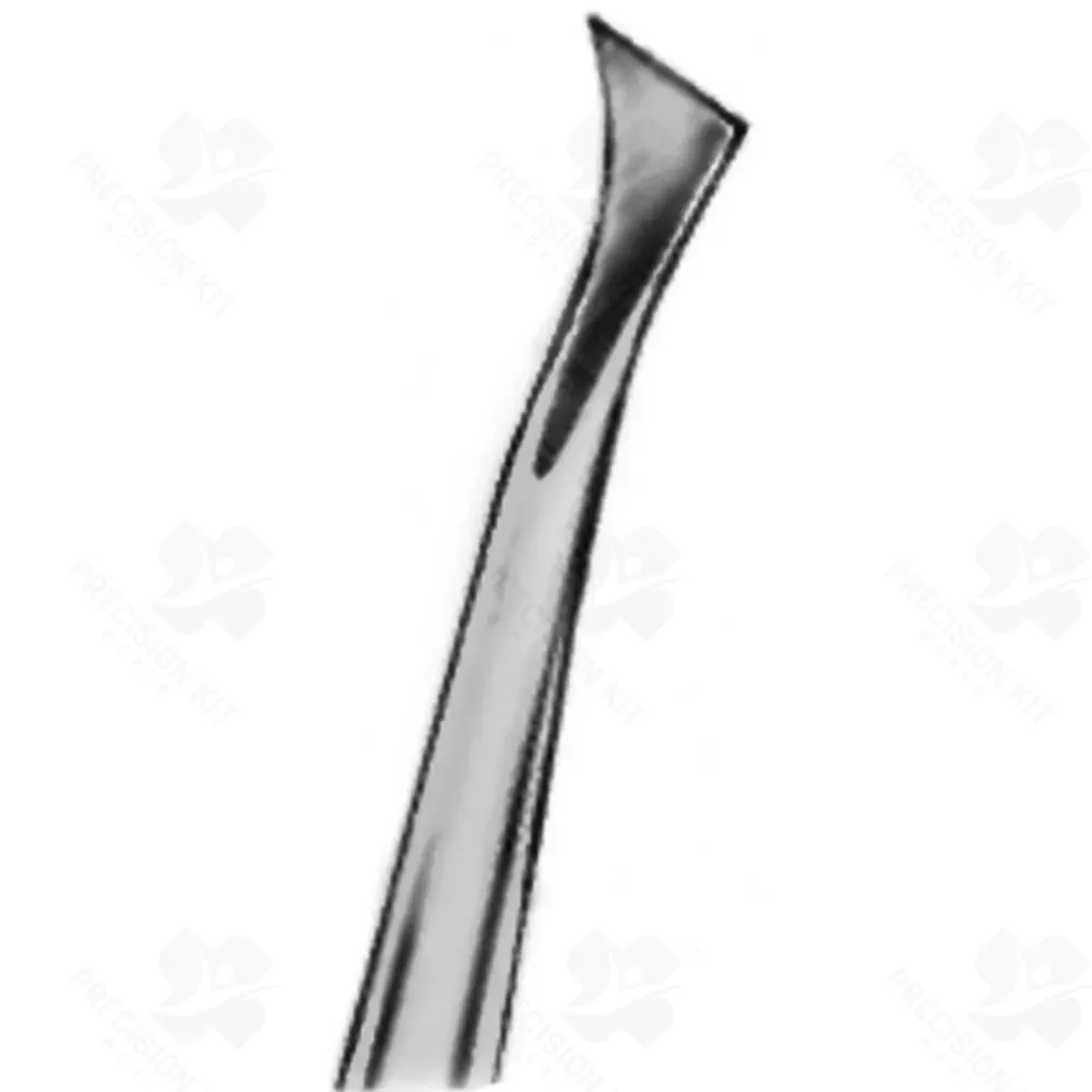 W.Barry [125mm (4.92in)] Used as a lever for the extraction of a tooth or retained roots. It is pushed in between the gums and the external part of the tooth and used to loosen the tissue surrounding the tooth. The blade transmits a force, generated by rotating the handle around its long axis, to the surface of the tooth or root. This produces the displacement of the tooth away from the point of application where the elevator comes into contact with the tooth. The force may be applied perpendicularly to the tooth, with the elevator placed in the interdental space, or along its long axis. Since considerable force is applied to the tooth, it’s necessary to prevent the elevator from slipping. During its use, the operator’s index finger should therefore be extended over the length of the blade to act as a support on adjacent hard tissues. The curved blade of the elevator is placed on the root surface, thus lying between the tooth and the alveolar bone which acts as a fulcrum around which the elevator is turned. The rotation of the elevator will produce a force which dislocates the tooth and tends to displace it out of its socket. An equal force will also be applied to the fulcrum, so it is important to ensure that this alveolar bone is capable of resisting such a force and that is not an adjacent tooth which may, as a result, become inadvertently loosened or displaced. Elevators must be used with caution when extracting teeth to avoid generating excessive and potentially damaging forces.Pennant flag shaped. The use of a sharp-ended (east-west) elevator to remove a root of a multirooted tooth following extraction of an adjacent one is valuable. The sharp end is introduced to the depth of the socket generated by the removal of the first root and is used to engage the inter-radicular bone and remaining root. A rotational movement (wheel-and-axle rotation) is produced as the handle is rotated, allowing the root to be removed. The handle is in right angle to the shank and for this reason the elevator is very powerful and force generated is sufficient to fracture the mandible: it is recommended to use this elevator with great care to avoid fracture of the jaw. ROOT ELEVATOR LONDON HOSPITAL mm4 RIGHT ROOT ELEVATOR LONDON HOSPITAL mm4 RIGHT